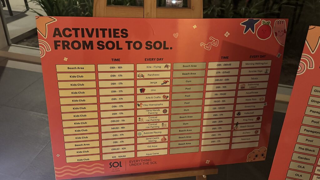毎日、ホテル内でいろいろなアクティビティが用意されています。自由に参加できます。