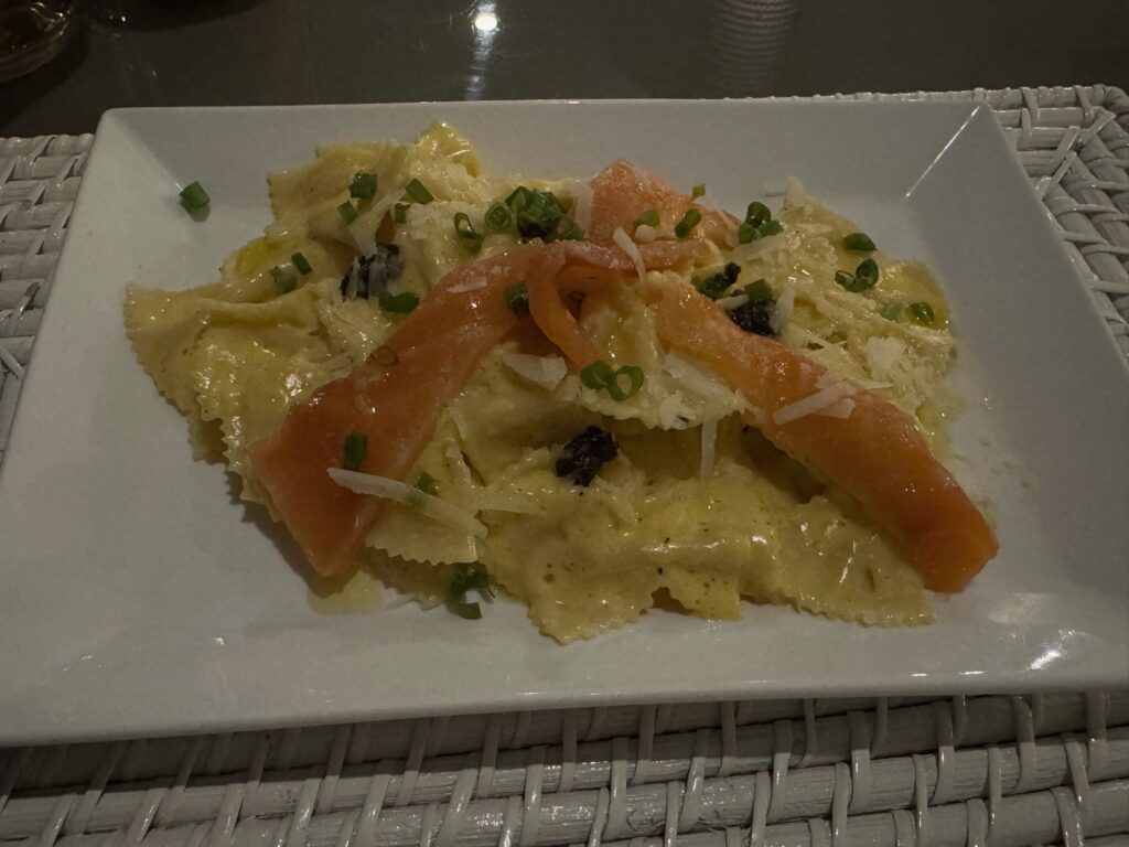 サーモンの下はペンネ。チーズたらり。